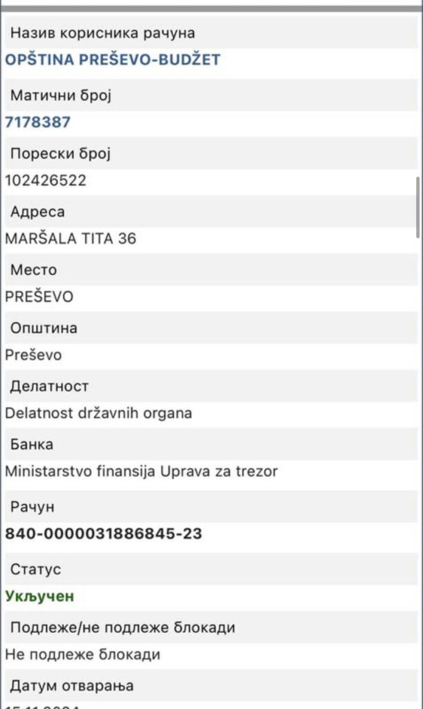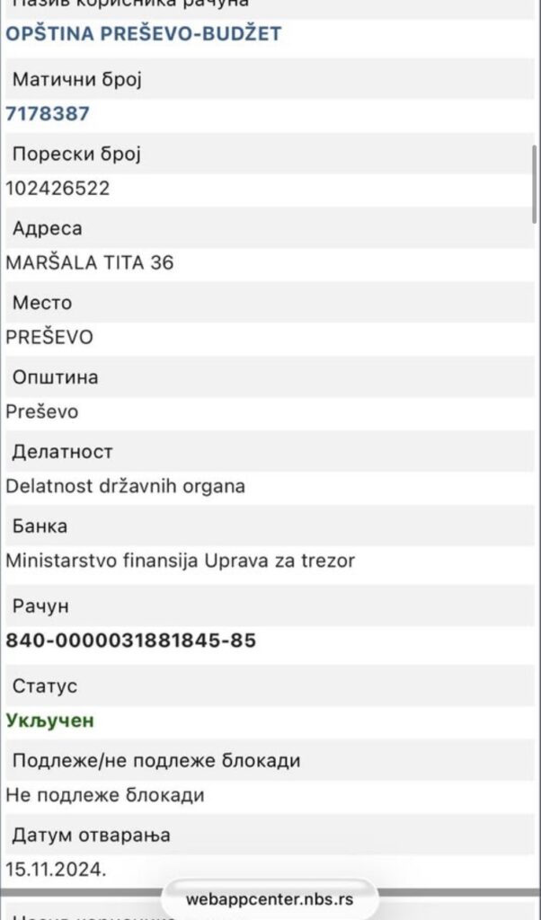 Nga të dhënat zyrtare të Regjistrit Unik të llogarive të Bankës Kombëtare të Serbisë, siç do ta shihni edhe në linkun e mëposhtëm të web faqes zyrtare si dhe foto dëshmive, rezulton se xhirollogaria kryesore e Komunës së Preshevës është aktive dhe funksionale, e poashtu edhe xhirollogaritë e Kryetares së Komunës, Kuvendit Komunal, Këshillit Komunal, Administratës Komunale dhe të gjitha njësive tjera organizative. Poashtu nga po të njejtat të dhëna, dëshmohet se Buxheti i Komunës realizohet pa asnjë pengesë qoftë ligjore apo financiare.